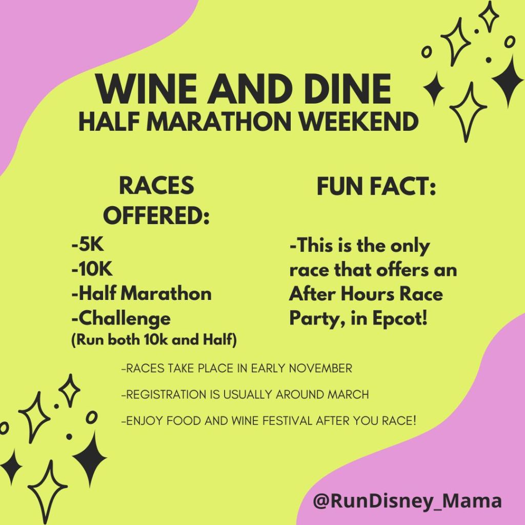 As you can see- Wine and Dine Half-Marathon doesn’t ONLY offer a half-marathon race, you also have the option to register for a 5K, 10K, or a combo of the races! One of my favorite parts of Wine and Dine Half-Marathon races is that they offer a Post-Race Party, after hours, in Epcot. This race weekend takes place during one of the last weeks of Food and Wine Festival in Epcot, so if you attend the Post Race Party, you get to experience Food and Wine Festival, lower wait times on ride, entertainment, and fun, and sometimes rare character meet and greets. Currently, and in years past- if you ran the Half-Marathon or did the Challenge (running both the 10K and Half) you would get a free ticket to the post race party. They offer tickets to purchase when registering for anyone not receiving one with their race or even for family and friends that may be with your party, but not racing at all!