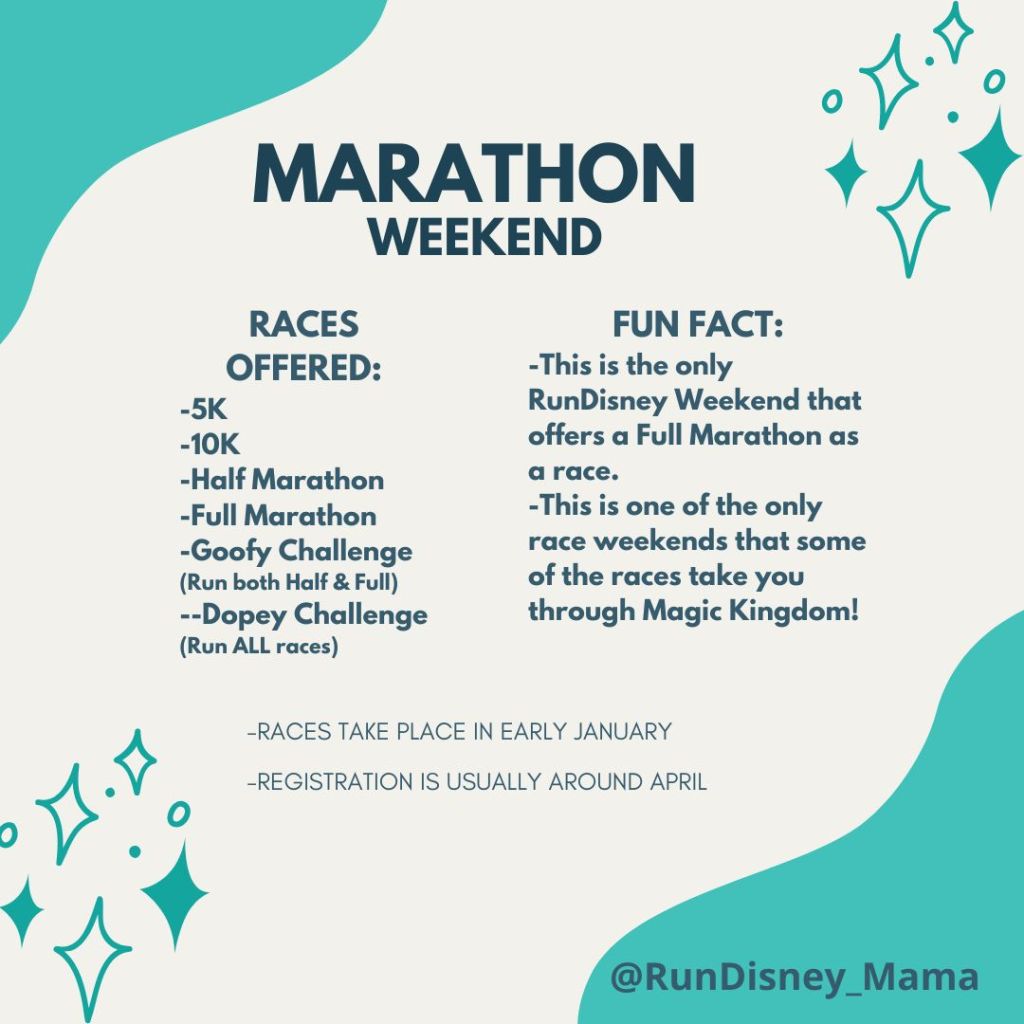Marathon Weekend is usually always during one of the early weeks of January. It is also the only race weekend that offers a FULL Marathon, in addition to a 5K, 10K, and Half-Marathon. This weekend is known for the big challenges it offers! By signing up for the Goofy Challenge- you’re signing up to run both the Half and Full Marathons! If you’re REALLY up for a challenge- you can sign up for the Dopey Challenge, meaning you will run ALL of the races offered that weekend- the 5K, 10K, Half Marathon, and the Full Marathon! I’ve yet to do either of those challenges, but how amazing that so many people do complete them! You also walk away with a medal for each of the races as well as the challenge medal(s) you get, by completing them! If running through Magic Kingdom and the Castle is high on your priority list- this is one of the two race weekends for you. If you run the Half-Marathon or Full-Marathon, you’ll get the chance to run through Magic Kingdom! While all races take you through some parts of the parks, not all race weekends offer races that go through Magic Kingdom.