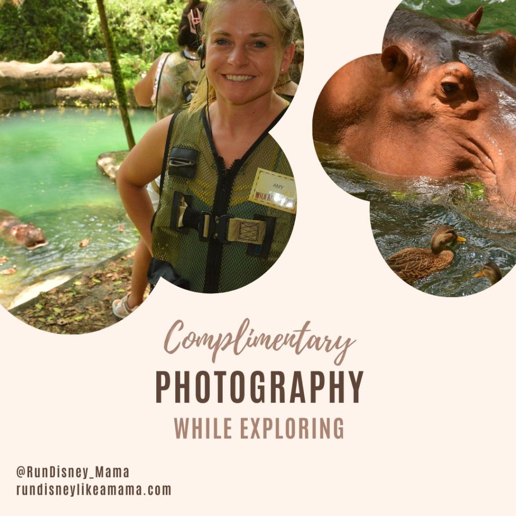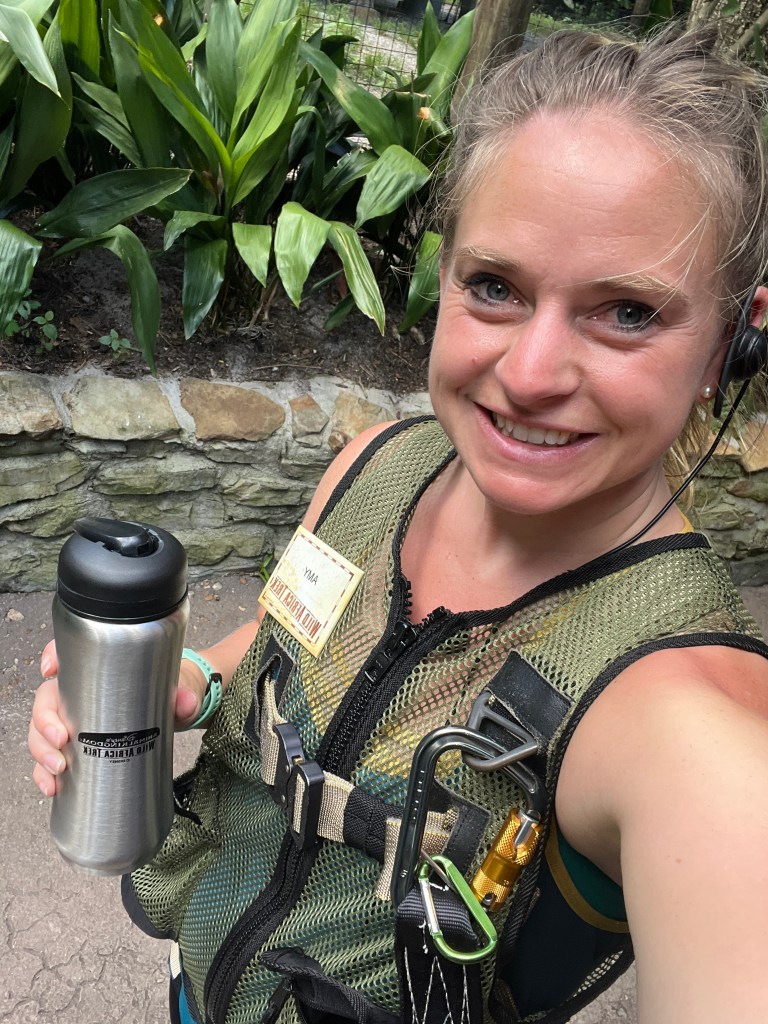 Once you’re checked in, they’ll lead you to an area right behind this booth where you are given a locker. You can not have any loose items on you. They’ll suit you up with a vest, and even a clip for your phone if you are using it as a camera. You are also allowed to bring your phone or your own camera, but it must have a strap to attach it to your body. One of the little gifts your receive is a water bottle to use while on your trek! It will also come with a strap to attach to your vest and equipment. The last item they give you is an ear piece. Since you’re in a bigger group, and outside, the ear piece just makes it easier to hear your leaders! Typically two cast members will lead your group on your trek. They also bring along a nice camera, and will be taking pictures the entire time. They even make sure to get pictures of you throughout the tour, and are happy to take pictures of anything you ask them to. (You’ll get a link to attach these photos to your My Disney Experience account and download!)